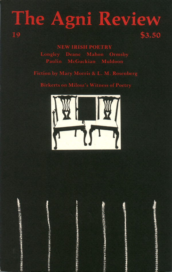 AGNI 19 features a group of “younger Irish poets”: Medbh McGuckian, Derek Mahon, Seamus Deane, Michael Longley, Paul Muldoon, Tom Paulin, and Frank Ormsby. Born from the aftermath of the prolonged violence between Ireland and England, their poems work toward their nation’s collective goal: to form an identity separate from that of the English. Complementing this are poems by James Galvin, Cynthia Huntington, and William Harmon; fiction by Mary Morris and L. M. Rosenberg; and featured essays by Richard Pevear (on Ezra Pound and the “thinking in poetry”) and Sven Birkerts (on Czeslaw Milosz and The Witness of Poetry).