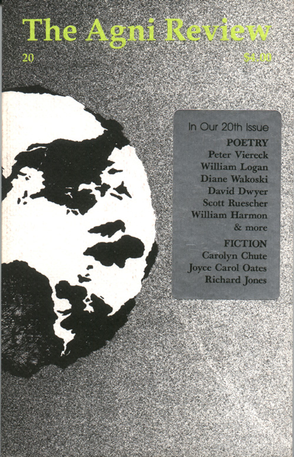 As early as AGNI 20 we see the work of beloved longtime contributors: fiction by Joyce Carol Oates, Carolyn Chute, and Richard Jones; poetry by David Wojahn, Diane Wakoski, Peter Viereck, Thomas Lynch, and William Harmon. Harmon also reviews Richard Jackson’s Acts of Mind and Stephen Berg’s In Praise of What Persists.